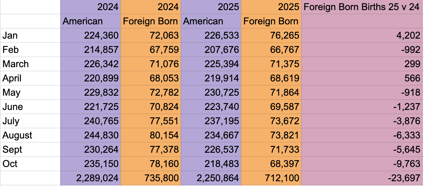 As I wrote in a previous post, the preliminary birth data is clear evidence that mass deportations are working. Comparing January-October 2025 with the year prior, the number of foreign-born women having children in the U.S. has declined by more than 20,000, with all those numbers coming in the last few months since the administration ramped up mass deportations.
