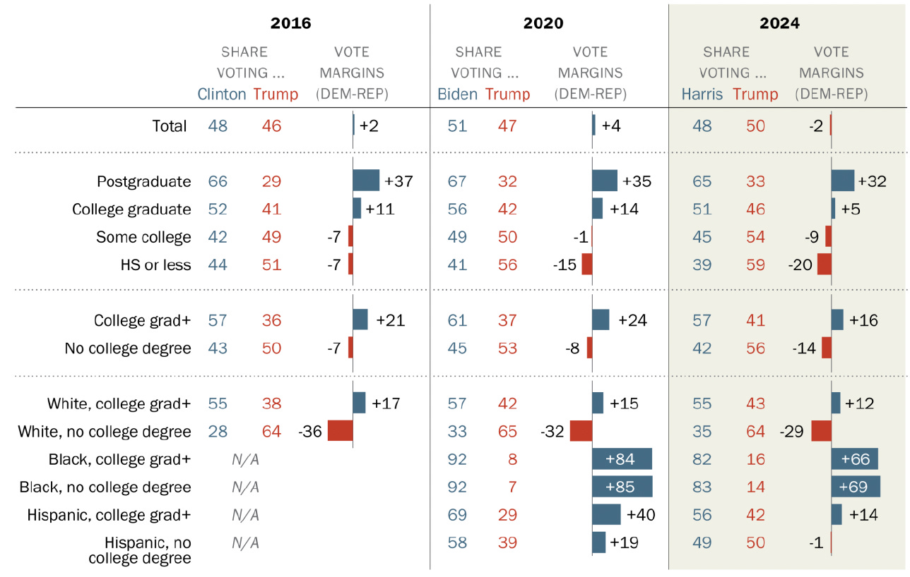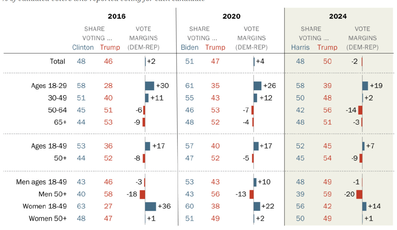 Pew found that by 2024, Trump’s numbers with black voters fell below a 70-point deficit, he lost Latinos by only three points, and 18-29 year olds moved seven points to the right from 2020.