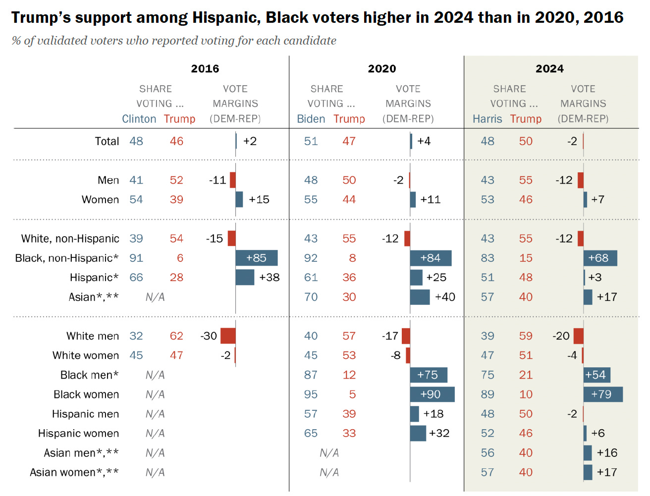 Using Pew Research exit polls from 2018 and 2024, you can see the immense growth Republicans enjoyed among these voters in the last couple of years.