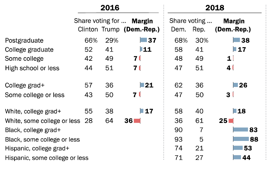 Republicans lead among whites without a college degree by 26 points, up about 1 point from 2018.