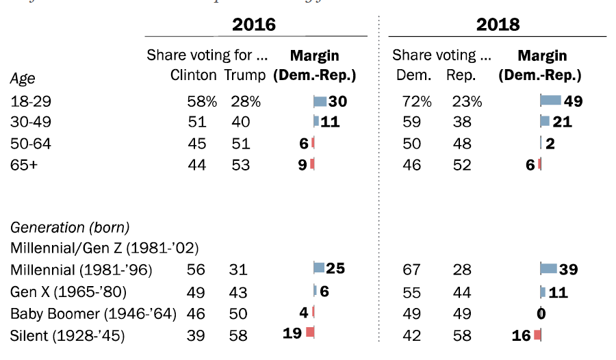 Democrats lead 18-29-year-olds by 27 points, down 22 points from 2018.
